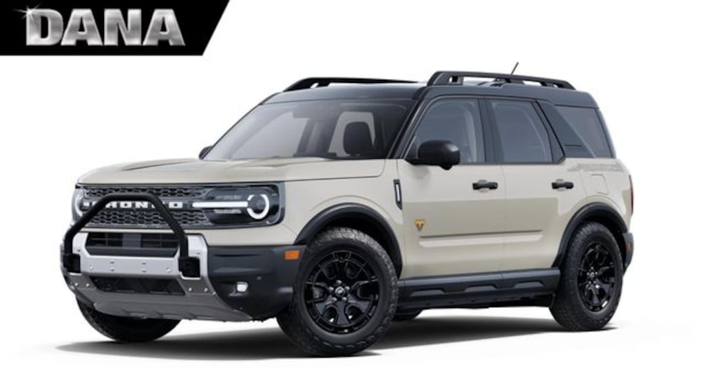Desert Sand 2025 Ford Bronco Sport Badlands 4WD 8-Speed Automatic EcoBoost 2.0L I4 GTDi DOHC Turbocharged VCT 4-Wheel Disc Brakes, 6 Speakers, 850W Engine Cooling Fan, ABS brakes, Air Conditioning, Alloy wheels, AM/FM radio: SiriusXM, AM/FM Stereo, Auto High-beam Headlights, Auto-dimming Rear-View mirror, Automatic temperature control, Auxiliary Switches & Wiring, B&O Sound System by Bang & Olufsen, Badlands Tech Package, Brake assist, Brush Guard, Compass, Connected Navigation, Delay-off headlights, Driver door bin, Driver vanity mirror, Dual front impact airbags, Dual front side impact airbags, Electronic Stability Control, Emergency communication system: SYNC 4 911 Assist, Equipment Group 400A, Fender Tie Downs, Four wheel independent suspension, Front anti-roll bar, Front Bucket Seats, Front Center Armrest, Front fog lights, Front License Plate Bracket, Front reading lights, Fully automatic headlights, Garage door transmitter, HD Radio, Heated door mirrors, Heated front seats, Heated steering wheel, High Clearance Fender Flares, HOSS 3.0 Off-Road Suspension, Illuminated entry, Knee airbag, Leather Trimmed Front Bucket Seats, Low tire pressure warning, Memory seat, Occupant sensing airbag, Outside temperature display, Overhead airbag, Overhead console, Panic alarm, Passenger door bin, Passenger vanity mirror, Power door mirrors, Power driver seat, Power passenger seat, Power steering, Power windows, Radio data system, Rear anti-roll bar, Rear Black Bumpers, Rear reading lights, Rear seat center armrest, Rear window defroster, Rear window wiper, Recovery Hooks, Remote keyless entry, Sasquatch Badlands Package, Sasquatch Graphic Package, Security system, SiriusXM, Speed control, Speed-sensing steering, Speed-Sensitive Wipers, Split folding rear seat, Steering wheel mounted audio controls, SYNC 4 w/Enhanced Voice Recognition, Tachometer, Telescoping steering wheel, Tilt steering wheel, Traction control, Trip computer, Variably intermittent wipers, Wheels: 17" Ebony Black-Painted Aluminum, Wheels: 17" Matte Black-Painted Aluminum.