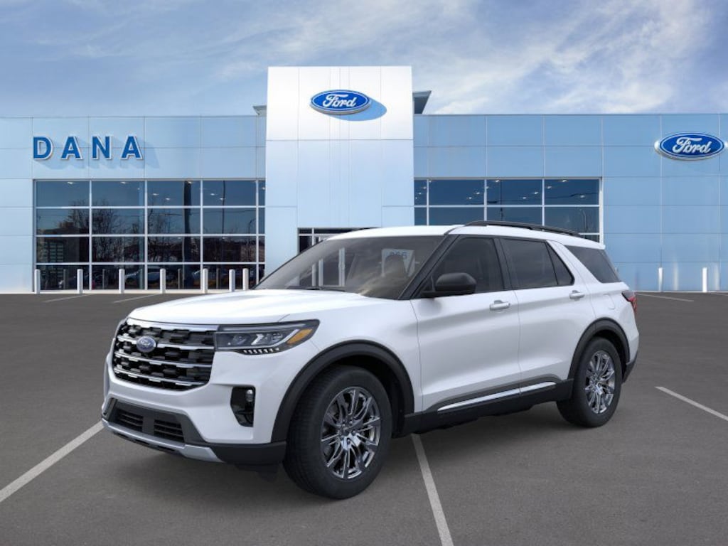 Space White Metallic 2025 Ford Explorer Active 4WD 10-Speed Automatic 2.3L EcoBoost I-4 4WD, 3.58 Non-Limited Slip Rear Axle, 3rd row seats: bench, 4-Wheel Disc Brakes, 6 Speakers, ABS brakes, Active Comfort Package, Air Conditioning, Alloy wheels, AM/FM radio: SiriusXM with 360L, AM/FM Stereo, Apple CarPlay/Android Auto, Auto High-beam Headlights, Automatic temperature control, Brake assist, Bumpers: body-color, Compass, Delay-off headlights, Driver door bin, Driver vanity mirror, Dual front impact airbags, Dual front side impact airbags, Electronic Stability Control, Emergency communication system: 911 Assist, Exterior Parking Camera Rear, Four wheel independent suspension, Front anti-roll bar, Front Bucket Seats, Front Center Armrest, Front dual zone A/C, Front Fascia, Front License Plate Bracket, Front reading lights, Fully automatic headlights, Heated ActiveX Seating Material Captain's Chairs, Heated door mirrors, Heated front seats, Heated Steering Wheel, Illuminated entry, Internet access capable: FordPass Connect 5G, Knee airbag, Leather steering wheel, Low tire pressure warning, Navigation System, Occupant sensing airbag, Outside temperature display, Overhead airbag, Overhead console, Panic alarm, Panoramic Vista Roof w/Power Shade, Passenger door bin, Passenger vanity mirror, Power door mirrors, Power driver seat, Power Liftgate, Power passenger seat, Power steering, Power windows, Rear air conditioning, Rear anti-roll bar, Rear reading lights, Rear window defroster, Rear window wiper, Remote keyless entry, Remote Start System, Second Row HVAC Controls, SecuriCode Keyless Entry Keypad, Security system, Speed control, Speed-sensing steering, Speed-Sensitive Wipers, Split folding rear seat, Spoiler, Steering wheel mounted audio controls, Tachometer, Telescoping steering wheel, Tilt steering wheel, Traction control, Trip computer, Unique Heated Cloth Captain's Chairs, Universal Garage Door Opener (UGDO), Variably intermittent wipers, Wheels: 18" Sparkle Silver-Painted Aluminum, Wheels: 20" Luster Nickel-Painted Aluminum, 4WD.