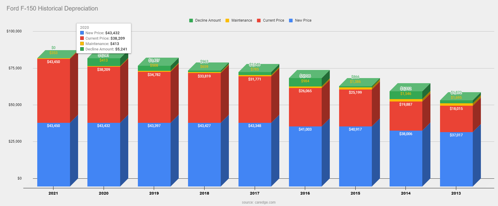 We have an amazing inventory of used F-150 models from various model years. For example, if you're interested in a newer model with some of the most recent advancements, a 2020 Ford F-150 is a great choice. All vehicles depreciate over time and with the pinch in new Ford inventory, why not shop used? The challenge is finding the right used Ford F-150 truck model year based on depreciation to get the most bang for your buck.